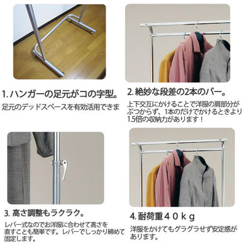 商品説明文 上下2段のハンガーに洋服を交互に掛けると、厚みのある肩部分をずらして、 同じ間口のハンガーの1.5倍もの着数が掛けられます。