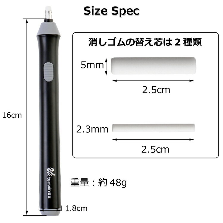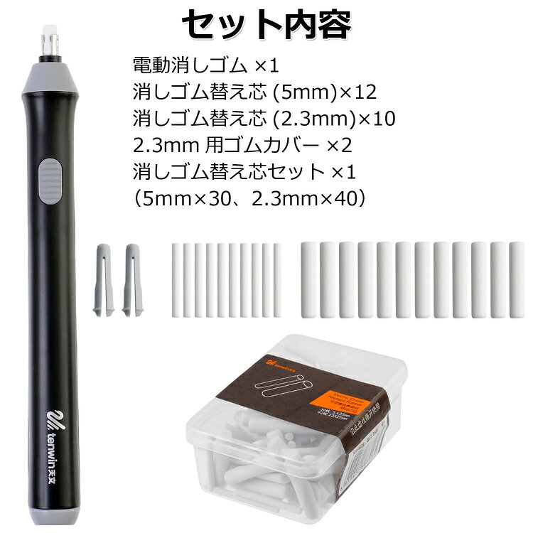 【 セット内容 】電動消しゴム × 1消しゴム替え芯 : 5mm × 12、2.3mm × 10、2.3mmゴムカバー × 2消しゴム替え芯セット : 5mm × 30、2.3mm × 40【 SIZE SPEC 】電動消しゴム : 16cm × 1.8cm替え芯 : 5mm : 2.5cm × 5mm、2.3mm : 2.5cm × 2.3mm重量 : 約48g