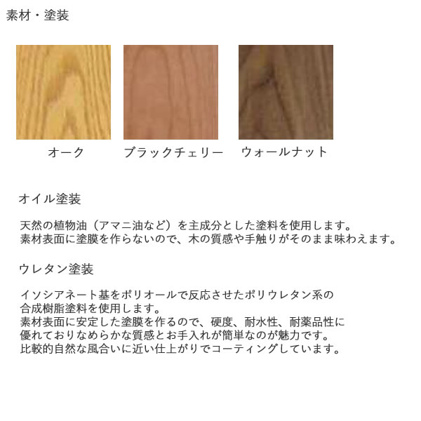 自然オイルを使用したものと、ホルムアルデヒド基準をクリアーした塗料を使用したものがあります。