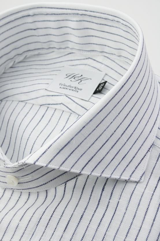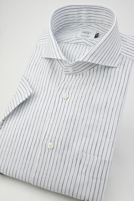 (ウィンザーノット アルバートアベニュー) Windsorknot Albert Avenue 半袖ホリゾンタルワイドカラーシャツ ネイビーのストライプ 日本製 リネン 麻100% (細身) ドレスシャツ( 送料無料 )